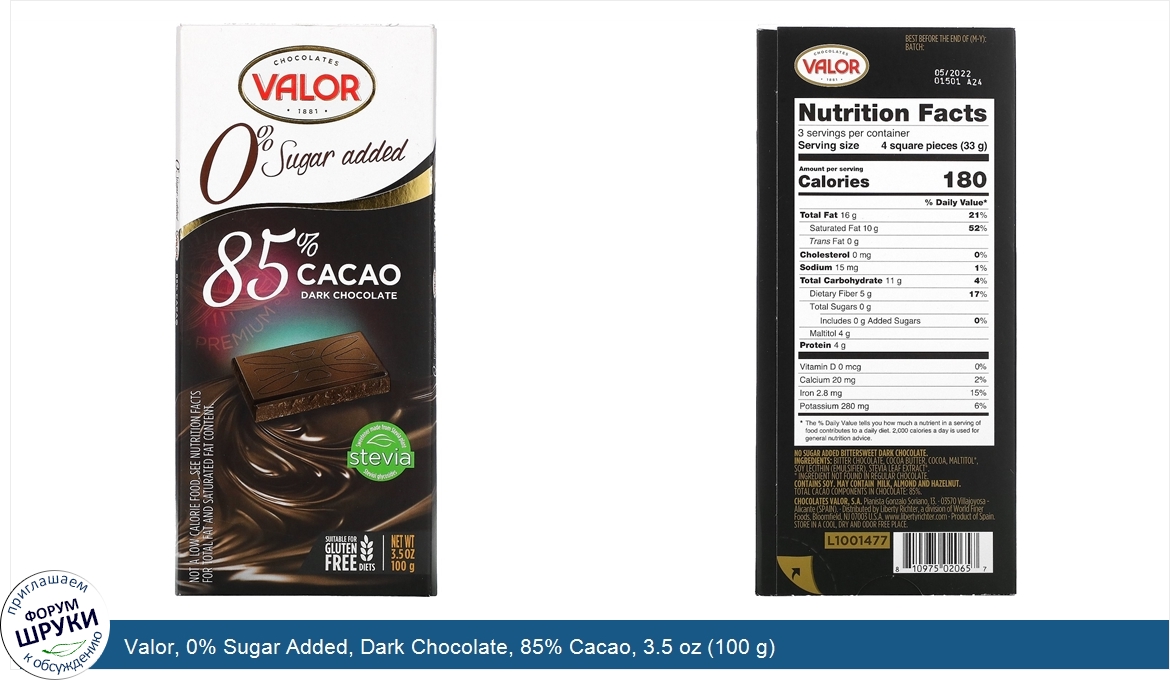 Друзья, если у вас есть отзыв/дополнение/комментарий/вопрос относительно Valor, 0% Sugar Added, Dark Chocolate, 85% Cacao, 3.5 oz (100 g) - напишите его ответом в эту тему (это будет полезно всему сообществу в целом и вам в отдельности).