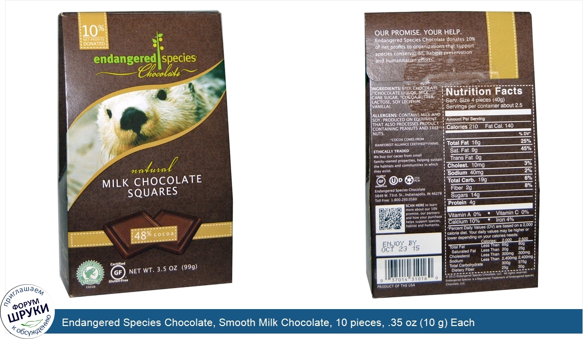 Друзья, если у вас есть отзыв/дополнение/комментарий/вопрос относительно Endangered Species Chocolate, Smooth Milk Chocolate, 10 pieces, .35 oz (10 g) Each - напишите его ответом в эту тему (это будет полезно всему сообществу в целом и вам в отдельности).
