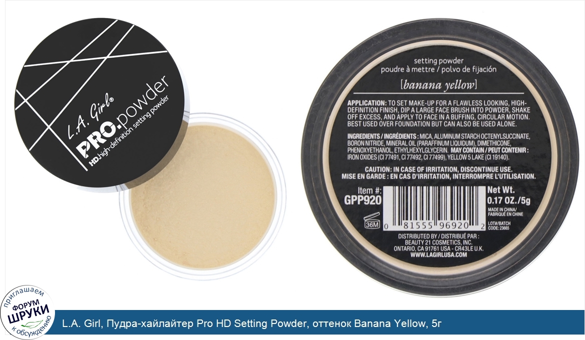 Друзья, если у вас есть отзыв/дополнение/комментарий/вопрос относительно L.A. Girl, Пудра-хайлайтер Pro HD Setting Powder, оттенок Banana Yellow, 5г - напишите его ответом в эту тему (это будет полезно всему сообществу в целом и вам в отдельности).
