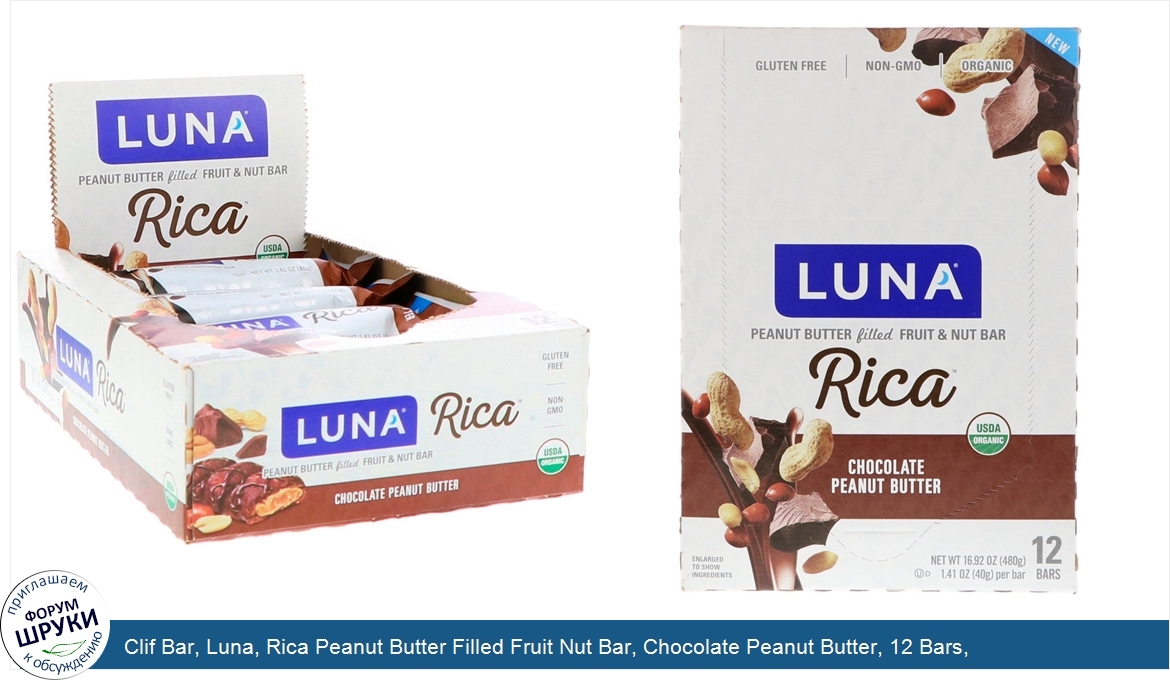 Clif Bar, Luna, Rica Peanut Butter Filled Fruit Nut Bar, Chocolate Peanut Butter, 12 Bars, 1.41 oz (40 g) Each