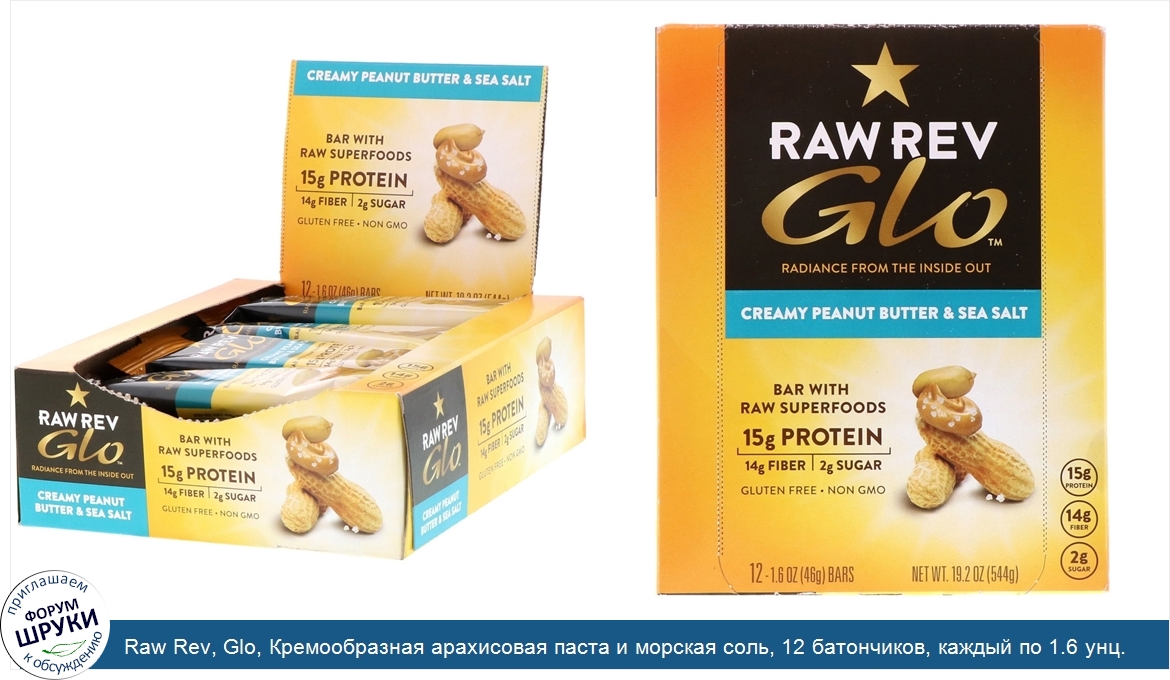 Raw Rev, Glo, Кремообразная арахисовая паста и морская соль, 12 батончиков, каждый по 1.6 унц. (46 г)