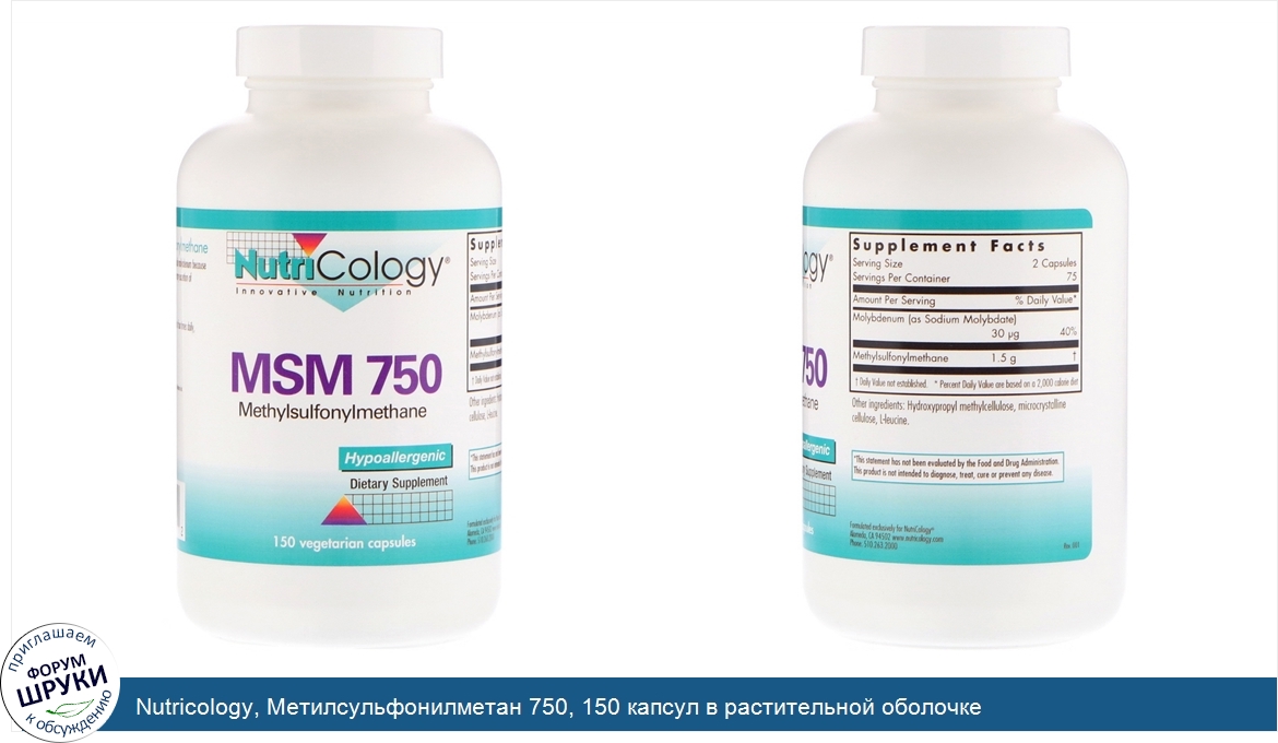 Друзья, если у вас есть отзыв/дополнение/комментарий/вопрос относительно Nutricology, Метилсульфонилметан 750, 150 капсул в растительной оболочке - напишите его ответом в эту тему (это будет полезно всему сообществу в целом и вам в отдельности).