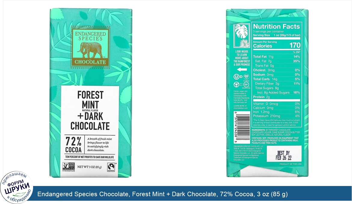 Друзья, если у вас есть отзыв/дополнение/комментарий/вопрос относительно Endangered Species Chocolate, Forest Mint + Dark Chocolate, 72% Cocoa, 3 oz (85 g) - напишите его ответом в эту тему (это будет полезно всему сообществу в целом и вам в отдельности).