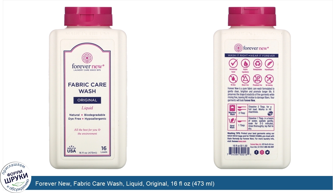 [DESCRIPT]Laundry Care Since 1975. All The Best For You the Environment. Natural. Dye Free. Biodegradable. Hypoallergenic. All The Best. 16 Loads. Wash it Right. Wear it Forever. Dermatology Tested. Organic Ingredients. Bleach-Free. Phosphate Free. No Coloring. Forever New is a pure fabric care wash formulated to gently clean, brighten and promote longer life. It preserves the shape elasticity of fine garments while rinsing free, leaving no residue to damage fibers. Your garments will look Forever New.[/DESCRIPT]... (описание дополняется)