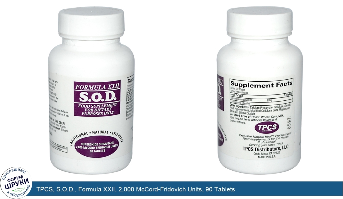 Друзья, если у вас есть отзыв/дополнение/комментарий/вопрос относительно TPCS, S.O.D., Formula XXII, 2,000 McCord-Fridovich Units, 90 Tablets - напишите его ответом в эту тему (это будет полезно всему сообществу в целом и вам в отдельности).