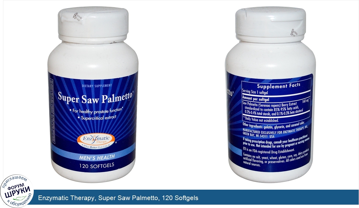 Друзья, если у вас есть отзыв/дополнение/комментарий/вопрос относительно Enzymatic Therapy, Super Saw Palmetto, 120 Softgels - напишите его ответом в эту тему (это будет полезно всему сообществу в целом и вам в отдельности).
