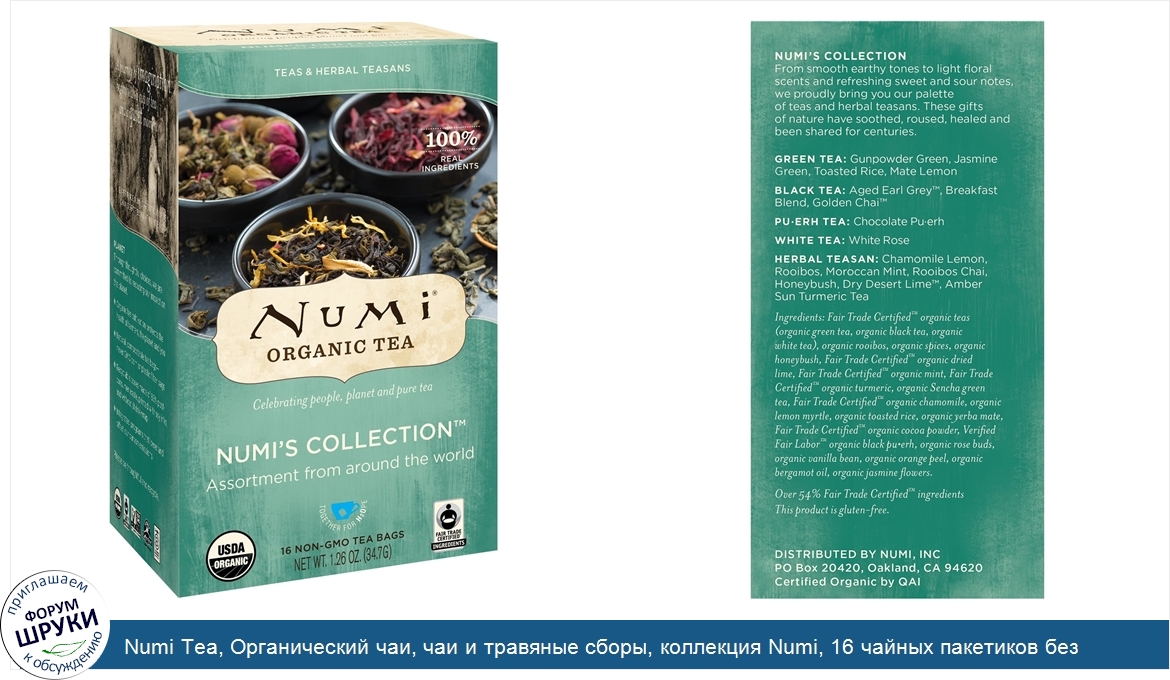 [DESCRIPT]100% Real Ingredients. Celebrating People, Planet and Pure Tea. Assortment from Around the World. Together for H2Ope. Non-GMO Tea Bags. USDA Organic. Fair Trade Certified Ingredients. Certified Organic by QAI. Non GMO Project. Carbon Free. Certified B Corporation. Numi's Collection. From smooth earthy tones to light floral scents and refreshing sweet and sour notes, we proudly bring you our palette of teas and herbal teasans. These gifts of nature have soothed, roused, healed and been shared for centuries. Green Tea: Gunpowder Green, Jasmine Green, Toasted Rice, Mate Lemon. Black Tea: Aged Earl Grey, Breakfast Blend, Golden Chai. Pu-erh Tea: Chocolate Pu-erh. White Tea: White Rose. Herbal Teasan: Chamomile Lemon, Rooibos, Moroccan Mint, Rooibos Chai, Honeybush, Dry Desert Lime, Amber Sun Turmeric Tea. A journey of imagination begins with a cup of tea and a quiet moment. Planet. Through thoughtful choices, we are committed to reducing our impact on the planet. Organic tea cultivation protects the health of farmers, the planet and you. Natural biodegradable filter-paper tea bags; not GMO corn or plastic see-through bags. Recyclable boxes made of 85% post-consumer waste, printed with soy-based inks and without unneeded shrink-wrap. Programs that lower and offset our carbon emissions including a solar-powered production facility.[/DESCRIPT]... (описание дополняется)
