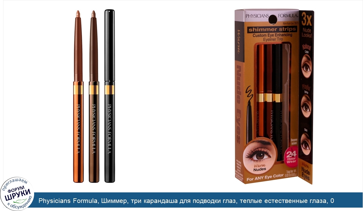 Друзья, если у вас есть отзыв/дополнение/комментарий/вопрос относительно Physicians Formula, Шиммер, три карандаша для подводки глаз, теплые естественные глаза, 0,03 унции (0,85 г) - напишите его ответом в эту тему (это будет полезно всему сообществу в целом и вам в отдельности).
