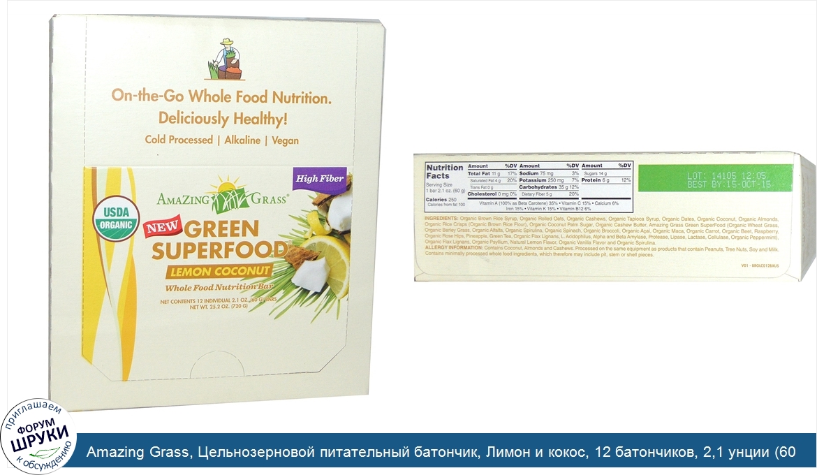 Друзья, если у вас есть отзыв/дополнение/комментарий/вопрос относительно Amazing Grass, Цельнозерновой питательный батончик, Лимон и кокос, 12 батончиков, 2,1 унции (60 г) каждый - напишите его ответом в эту тему (это будет полезно всему сообществу в целом и вам в отдельности).