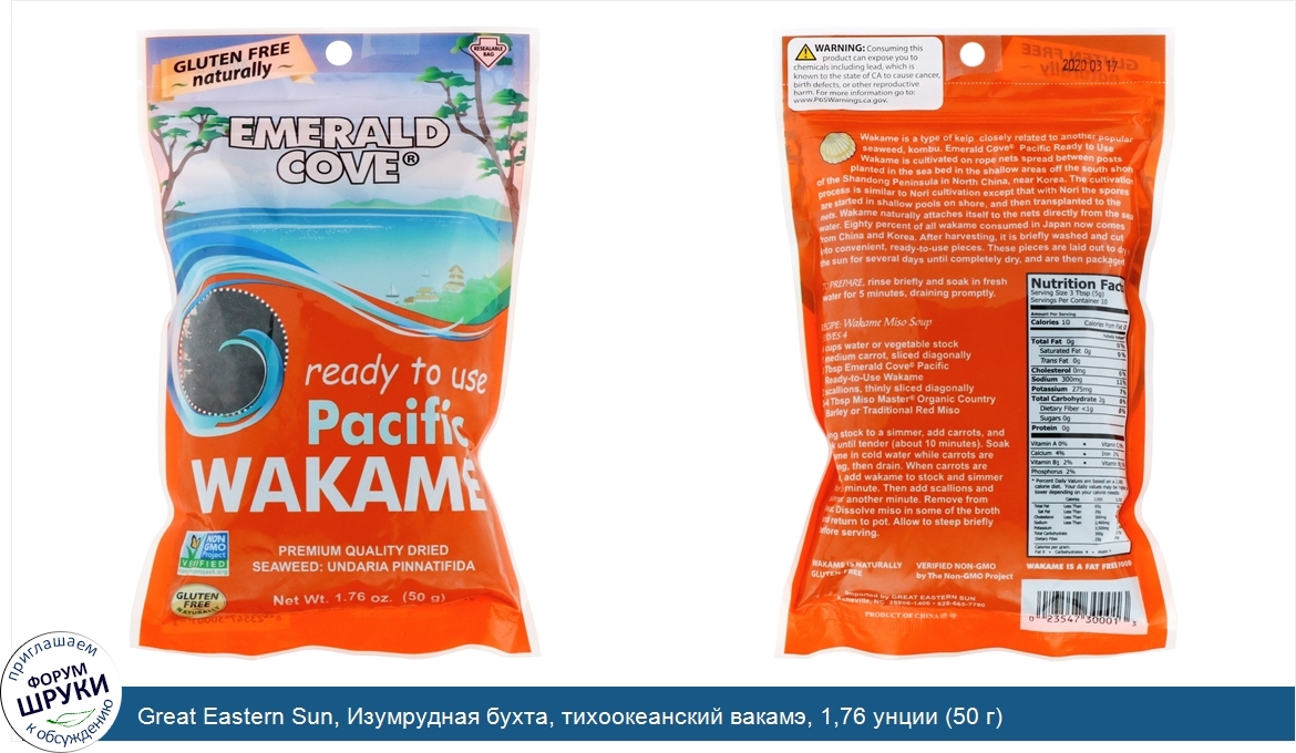 [DESCRIPT]Resealable Bag. Gluten Free Naturally. Ready to Use. Premium Quality Dried Seaweed: Undaria Pinnatifida. Non GMO Project Verified. Wakame is a Fat Free Food. Wakame is a type of kelp closely related to another popular seaweed, kombu. Emerald Cove Pacific Ready to Use Wakame is cultivated on rope nets spread between posts planted in the sea bed in the shallow areas off the south shore of the Shandong Peninsula in North China, near Korea. The cultivation process is similar to Nori cultivation except that with Nori the spores are started in shallow pools on shore, and then transplanted to the nets. Wakame naturally attaches itself to the nets directly from the sea water. Eighty percent of all wakame consumed in Japan now comes from China and Korea. After harvesting, it is briefly washed and cut into convenient, ready-to-use pieces. These pieces are laid out to dry in the sun for several days until completely crisp and dry, and are then packaged.[/DESCRIPT]... (описание дополняется)