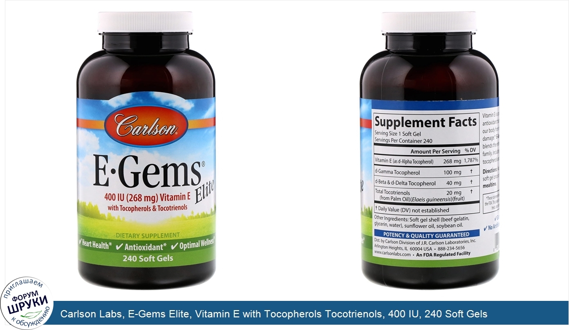 Друзья, если у вас есть отзыв/дополнение/комментарий/вопрос относительно Carlson Labs, E-Gems Elite, Vitamin E with Tocopherols Tocotrienols, 400 IU, 240 Soft Gels - напишите его ответом в эту тему (это будет полезно всему сообществу в целом и вам в отдельности).