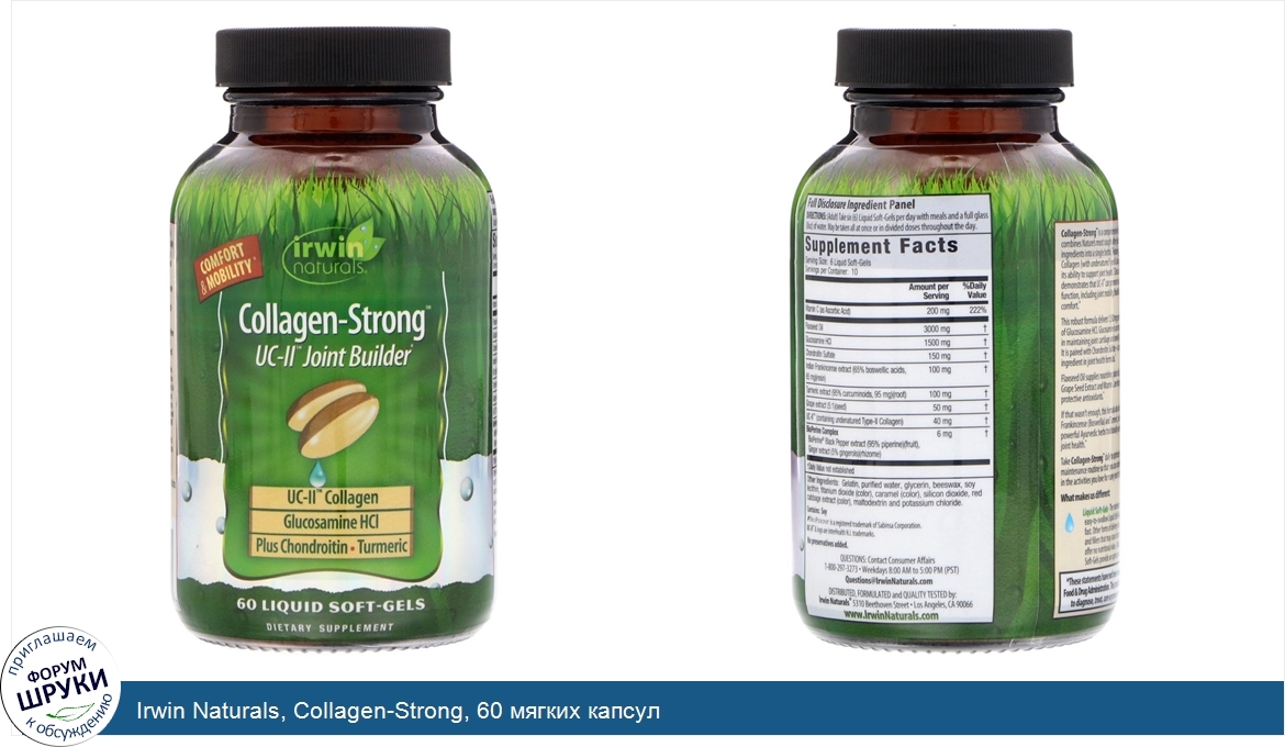 [DESCRIPT]Comfort Mobility. UC-II Joint Builder. UC-II Collagen. Glucosamine HCI. Plus Chondroitin - Turmeric. Dietary Supplements. Collagen-Strong is a comprehensive formula that combines Nature's most sought-after joint-optimizing ingredients into a single bottle. Featuring UC-II Collagen (with undenatured Type II Collagen) for its ability to support joint health. Clinical research demonstrates that UC-II can promote health joint function, including joint mobility, flexibility and comfort. This robust formula delivers 1,500 mg per daily serving of Glucosamine HCI. Glucosamine is an important factor in maintaining joint cartilage and overall joint health. It is paired with Chondroitin Sulfate - a common ingredient in joint health formulas. Flaxseed Oil supplies nourishing plant oils, while Grape Seed Extract and Vitamin C are integrated as protective antioxidants. If it wasn't enough, this formula also includes Indian Frankincense (Boswellia) and Turmeric, which are powerful Ayurvedic herbs traditionally used to support joint health. Take Collagen-Strong daily to optimize your joint maintenance routine so that you can continue to engage in the activities you love for many years to come. What makes us different:. Liquid Soft-Gels. - The nutrients in these easy-to-swallow Liquid Soft-Gels are released fast. Other forms of delivery can contain binders and fillers that may cause stomach upset and offer no nutritional value. Advanced Liquid Soft-gels provide an optimum delivery system. Quality Assurance. - Irwin Naturals is committed to providing the highest quality products for your health. We enjoy compliance testing to ensure purity and potency. Patented BioPerine. - Our special BioPerine Complex enhances the bioavailability absorption and potency of many nutrients.[/DESCRIPT]... (описание дополняется)