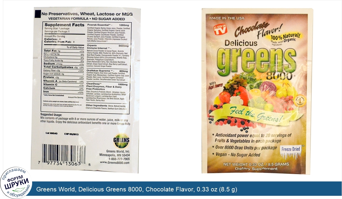 Друзья, если у вас есть отзыв/дополнение/комментарий/вопрос относительно Greens World, Delicious Greens 8000, Chocolate Flavor, 0.33 oz (8.5 g) - напишите его ответом в эту тему (это будет полезно всему сообществу в целом и вам в отдельности).