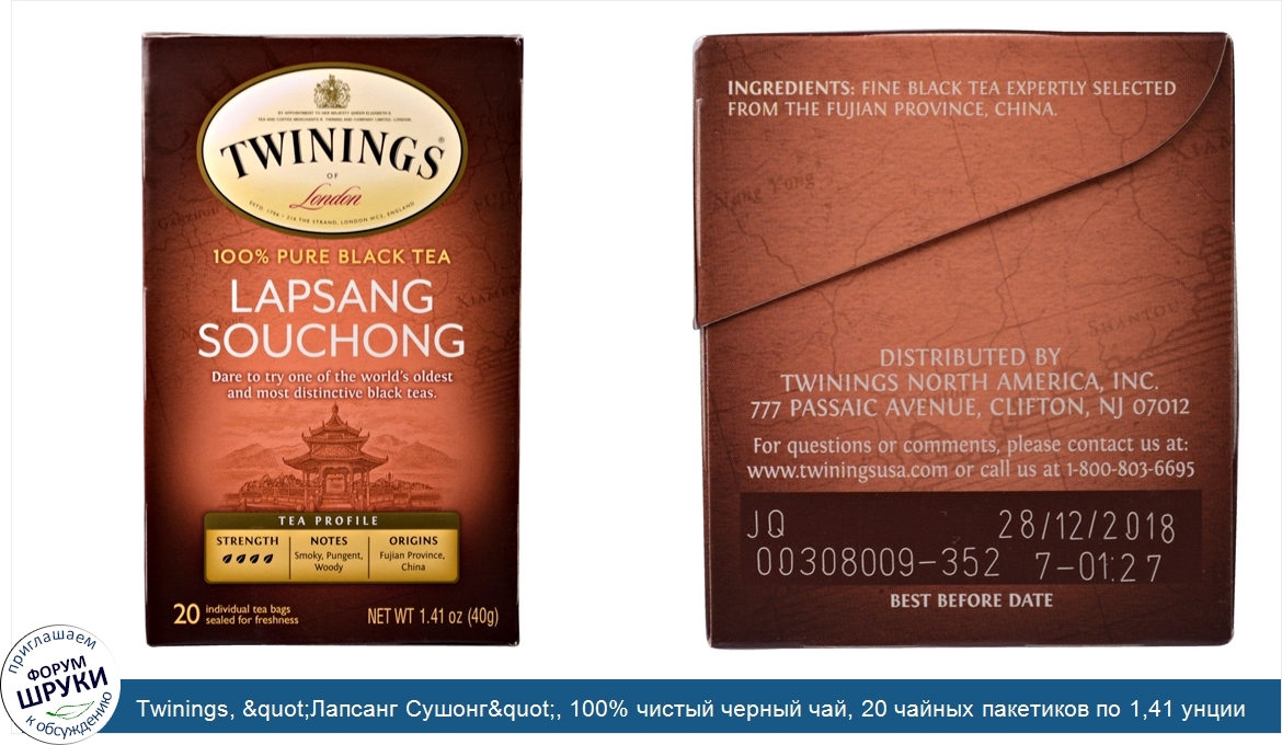 Друзья, если у вас есть отзыв/дополнение/комментарий/вопрос относительно Twinings, "Лапсанг Сушонг", 100% чистый черный чай, 20 чайных пакетиков по 1,41 унции (40 г) - напишите его ответом в эту тему (это будет полезно всему сообществу в целом и вам в отдельности).
