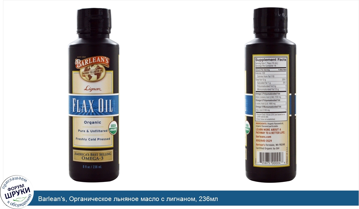 ru Barlean's, Органическое льняное масло с лигнаном, 236мл