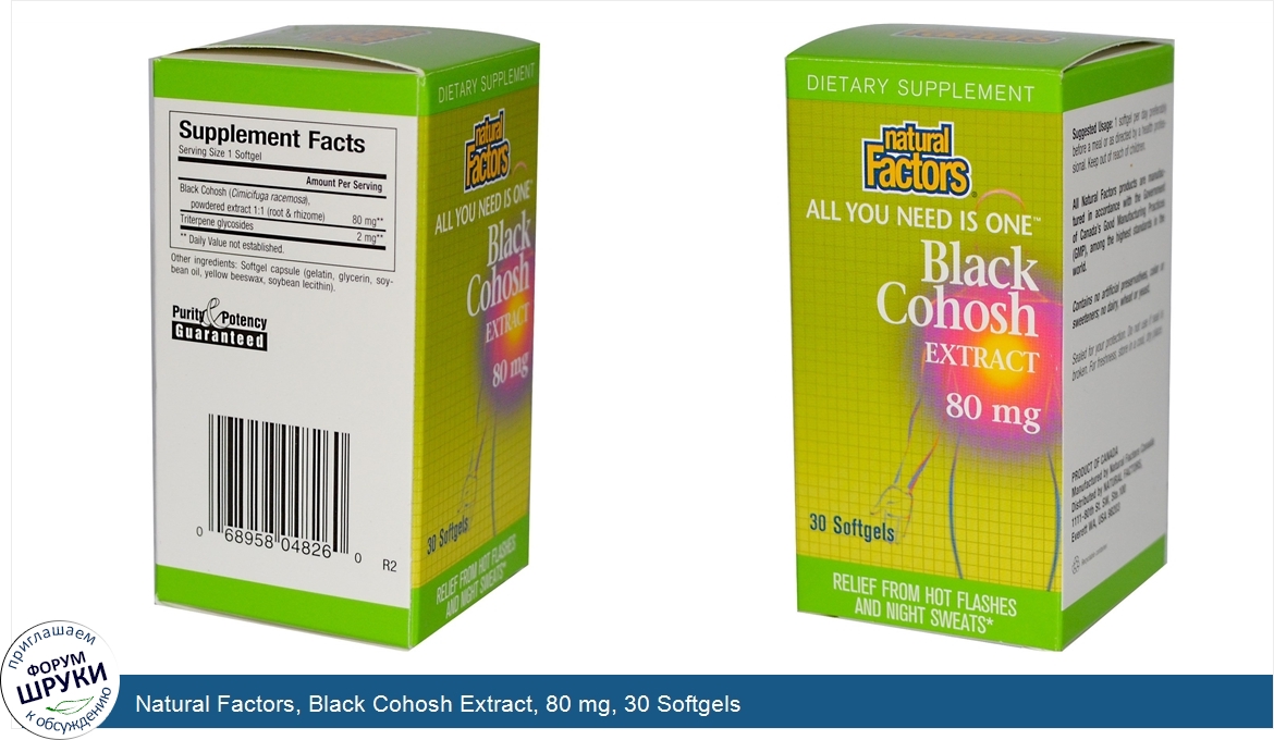 [DESCRIPT]Dietary Supplement. All you need is one. Relief from hot flashes and night sweats. Purity Potency Guaranteed. Natural Factors Black Cohosh Extract is standardized to provide a consistent dosage of the key active ingredient, triterpene glycoside, in a convenient one per day softgel. Black Cohosh Extract is a natural hormone replacement used to relieve the symptoms of perimenopause or menopause including hot flashes and night sweats. Black Cohosh Extract is non-estrogenic and thus balances the reproductive hormones, helping premenstrual discomfort, dysmenorrhea (painful menstruation) and menopausal symptoms. All Natural Factors products are manufactured in accordance with the Government of Canada's Good Manufacturing Practices (GMP), among the highest standards in the world.[/DESCRIPT]... (описание дополняется)