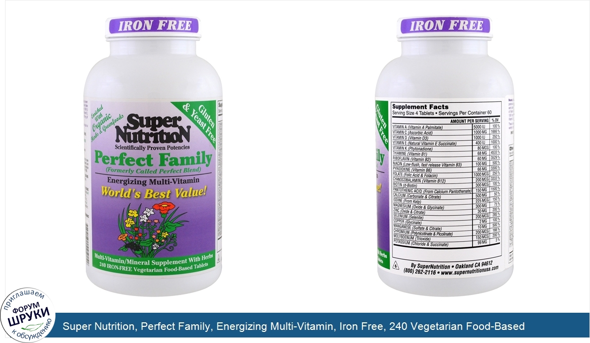 Друзья, если у вас есть отзыв/дополнение/комментарий/вопрос относительно Super Nutrition, Perfect Family, Energizing Multi-Vitamin, Iron Free, 240 Vegetarian Food-Based Tablets - напишите его ответом в эту тему (это будет полезно всему сообществу в целом и вам в отдельности).