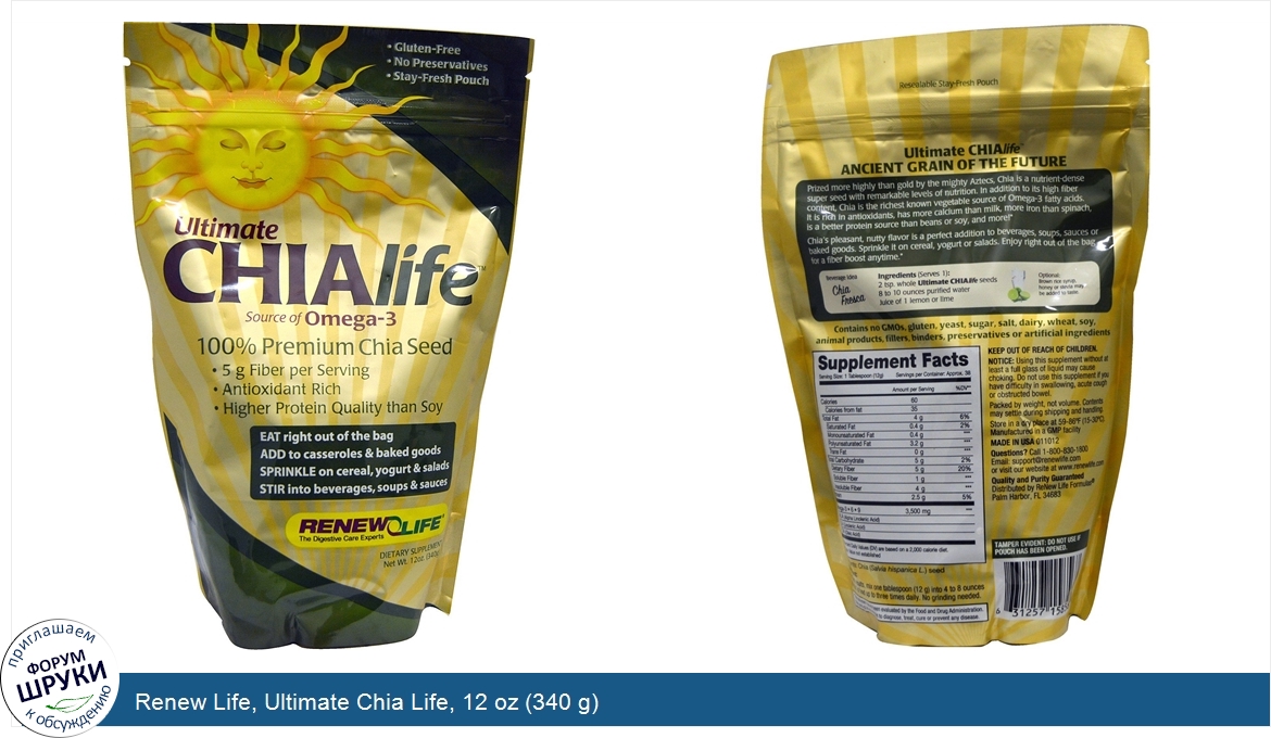 Друзья, если у вас есть отзыв/дополнение/комментарий/вопрос относительно Renew Life, Ultimate Chia Life, 12 oz (340 g) - напишите его ответом в эту тему (это будет полезно всему сообществу в целом и вам в отдельности).
