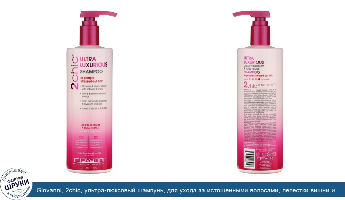 Друзья, если у вас есть отзыв/дополнение/комментарий/вопрос относительно Giovanni, 2chic, ультра-люксовый шампунь, для ухода за истощенными волосами, лепестки вишни и розы, 24 жидкие унции (710 мл) - напишите его ответом в эту тему (это будет полезно всему сообществу в целом и вам в отдельности).