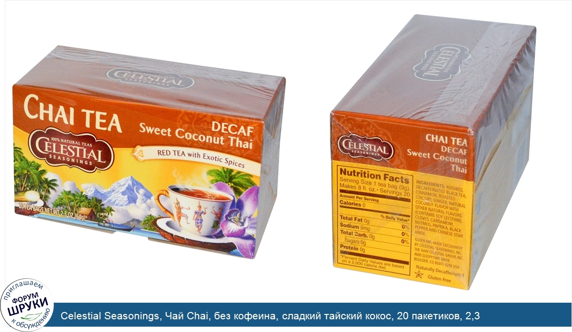 ru Celestial Seasonings, Чай Chai, без кофеина, сладкий тайский кокос, 20 пакетиков, 2,3 унции (64 г)