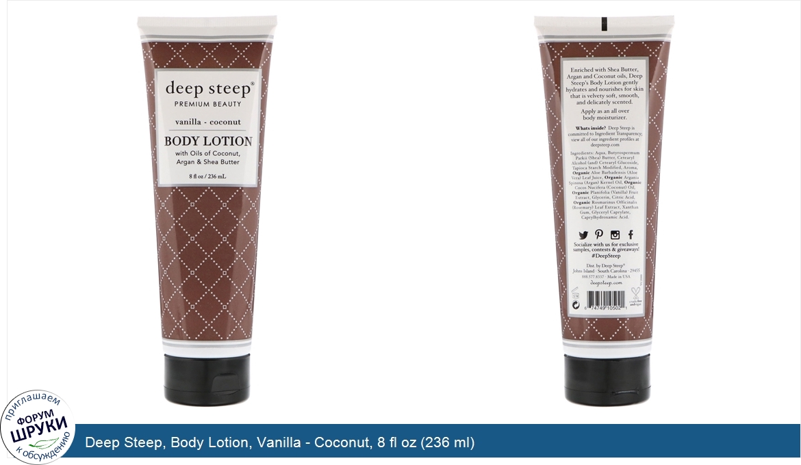 Друзья, если у вас есть отзыв/дополнение/комментарий/вопрос относительно Deep Steep, Body Lotion, Vanilla - Coconut, 8 fl oz (236 ml) - напишите его ответом в эту тему (это будет полезно всему сообществу в целом и вам в отдельности).