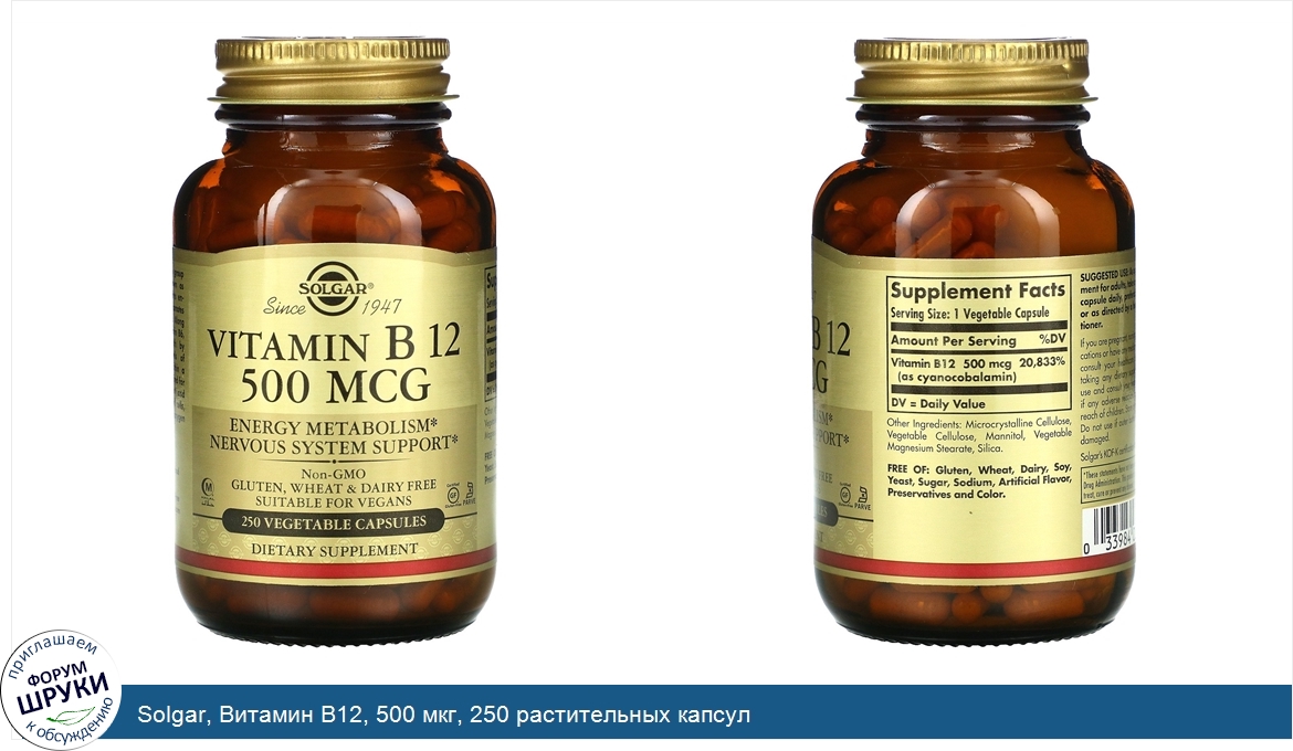 Solgar, Витамин B12, 500 мкг, 250 растительных капсул