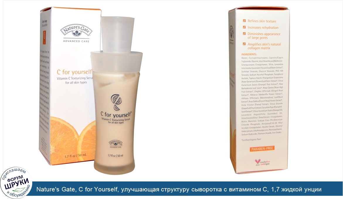 Друзья, если у вас есть отзыв/дополнение/комментарий/вопрос относительно Nature's Gate, C for Yourself, улучшающая структуру сыворотка с витамином С, 1,7 жидкой унции (50 мл) - напишите его ответом в эту тему (это будет полезно всему сообществу в целом и вам в отдельности).