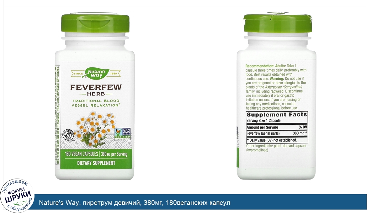 Nature\'s Way, пиретрум девичий, 380мг, 180веганских капсул