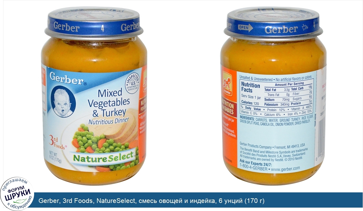 Друзья, если у вас есть отзыв/дополнение/комментарий/вопрос относительно Gerber, 3rd Foods, NatureSelect, смесь овощей и индейка, 6 унций (170 г) - напишите его ответом в эту тему (это будет полезно всему сообществу в целом и вам в отдельности).