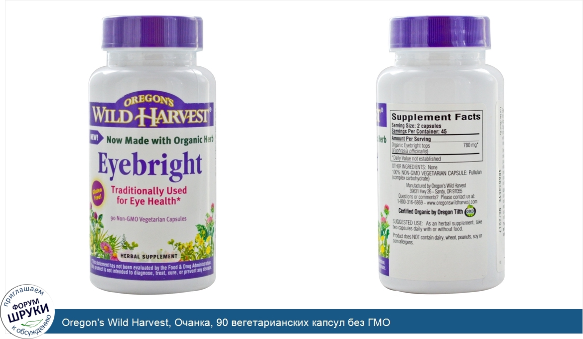 [DESCRIPT]Без глютена! Добавка из органических трав. Традиционный продукт для здоровья глаз. Органический продукт, сертифицированный Oregon Tilth. <р>Очанка используется со времён средневековья для поддержки зрения и борьбы с усталостью глаз. Согласно тексту древней «Доктрины Сигнатур», пурпурные и жёлтые пятна и полосы очанки напоминают налитые кровью глаза - индикатор того, что растение полезно и предназначено для использования в натуральной медицине и гербологии. Компания Oregon’s Wild Harvest с гордостью предлагает широкий выбор сертифицированных органических продуктов. Наша марка гарантирует, что вы покупаете продукты, которые выращиваются без применения вредных пестицидов, химических веществ или генетически модифицированных организмов (ГМО). Органическое земледелие благотворно сказывается на здоровье потребителей, благополучии работников и состоянии окружающей среды, которая является общей для всех нас.[/DESCRIPT]... (описание дополняется)