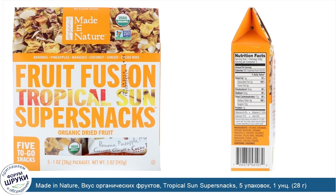 Друзья, если у вас есть отзыв/дополнение/комментарий/вопрос относительно Made in Nature, Вкус органических фруктов, Tropical Sun Supersnacks, 5 упаковок, 1 унц. (28 г) каждый - напишите его ответом в эту тему (это будет полезно всему сообществу в целом и вам в отдельности).