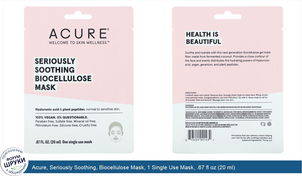 Друзья, если у вас есть отзыв/дополнение/комментарий/вопрос относительно Acure, Seriously Soothing, Biocellulose Mask, 1 Single Use Mask, .67 fl oz (20 ml) - напишите его ответом в эту тему (это будет полезно всему сообществу в целом и вам в отдельности).