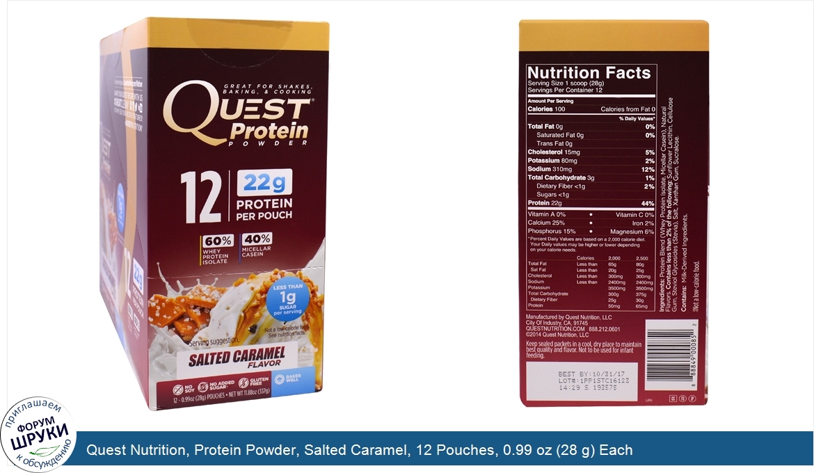 Друзья, если у вас есть отзыв/дополнение/комментарий/вопрос относительно Quest Nutrition, Protein Powder, Salted Caramel, 12 Pouches, 0.99 oz (28 g) Each - напишите его ответом в эту тему (это будет полезно всему сообществу в целом и вам в отдельности).