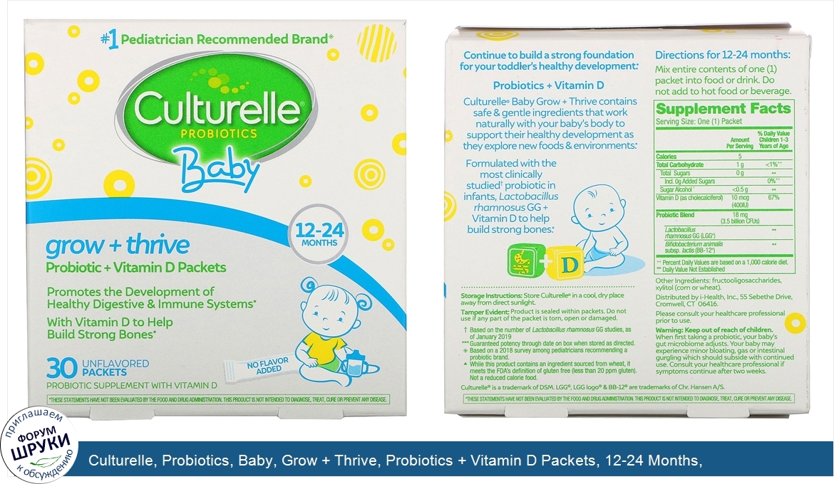 [DESCRIPT]#1 Pediatrician Recommended Brand♦. Promotes the Development of Healthy Digestive Immune Systems. With Vitamin D to Help Build Strong Bones. Unflavored Packets. Probiotic Supplement with Vitamin D. No Flavor Added. Naturally Sourced LGG®. Most Researched Strain in Children†. Purity Potency***. Dairy - Gluten - Soy Free^. The Culturelle® Difference∞. Continue to build a strong foundation for your toddler's healthy development:. Probiotics + Vitamin D. Culturelle® Baby Grow + Thrive contains safe gentle ingredients that work naturally with your baby's body to support their healthy development as they explore new foods environments. Formulated with most clinically studied† probiotic in infants, lactobacillus rhamnosus GG + Vitamin D to help build strong bones. Allergy Friendly Free From. Tree Nuts. Peanuts. Milk. Eggs. †Based on the number of Lactobacillus rhamnosus GG studies, as of January 2019. ***Guaranteed potency through date on box when stored as directed. ♦Based on a 2018 survey among pediatricians recommending a probiotic brand. ^While using this product contains an ingredient sourced from wheat, it meets the FDA's definition of gluten free (less than 20 ppm gluten). Not a reduced calorie food. ∞Excludes gummy formulas.[/DESCRIPT]... (описание дополняется)