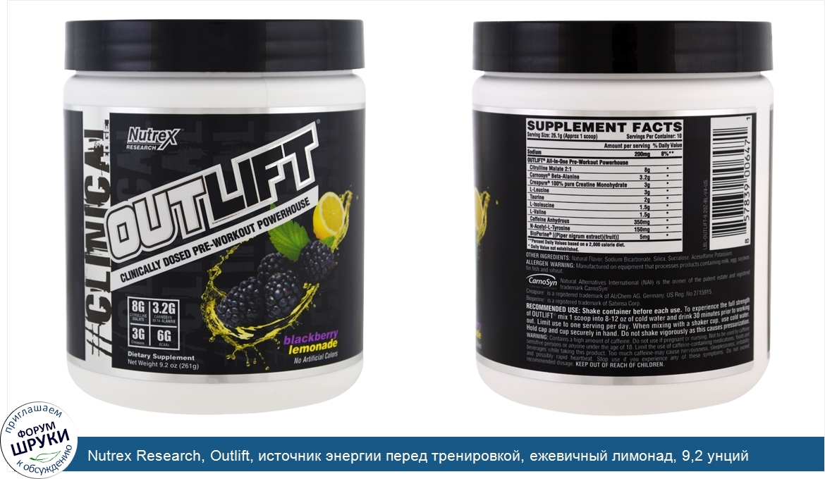 Друзья, если у вас есть отзыв/дополнение/комментарий/вопрос относительно Nutrex Research, Outlift, источник энергии перед тренировкой, ежевичный лимонад, 9,2 унций (261 г) - напишите его ответом в эту тему (это будет полезно всему сообществу в целом и вам в отдельности).