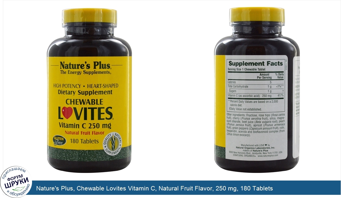 Друзья, если у вас есть отзыв/дополнение/комментарий/вопрос относительно Nature's Plus, Chewable Lovites Vitamin C, Natural Fruit Flavor, 250 mg, 180 Tablets - напишите его ответом в эту тему (это будет полезно всему сообществу в целом и вам в отдельности).