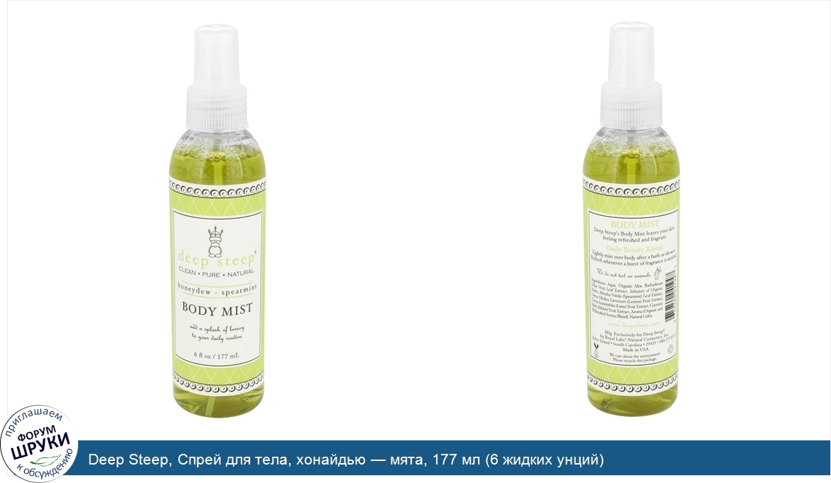 Друзья, если у вас есть отзыв/дополнение/комментарий/вопрос относительно Deep Steep, Спрей для тела, хонайдью — мята, 177 мл (6 жидких унций) - напишите его ответом в эту тему (это будет полезно всему сообществу в целом и вам в отдельности).