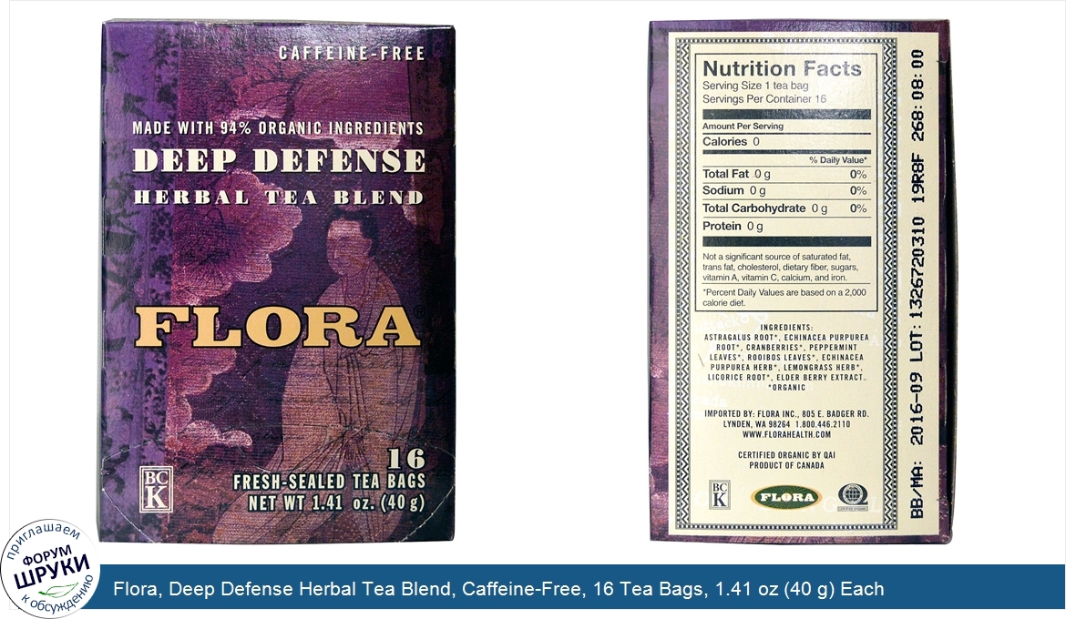 Flora, Deep Defense Herbal Tea Blend, Caffeine-Free, 16 Tea Bags, 1.41 oz (40 g) Each