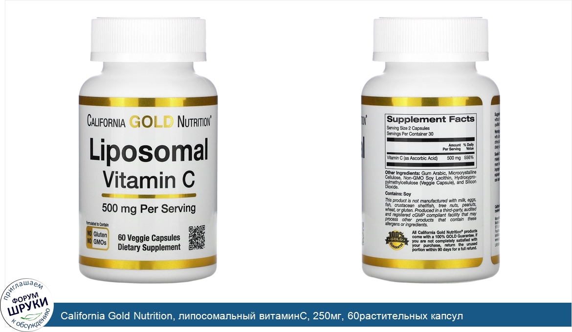 . Липосомальный витамин C. California Gold Nutrition. 500 мг в 1 порции. Антиоксидантное действие и поддержка иммунной системы*. Биодоступный липосомальный витамин C в растительных капсулах. Производится на предп...