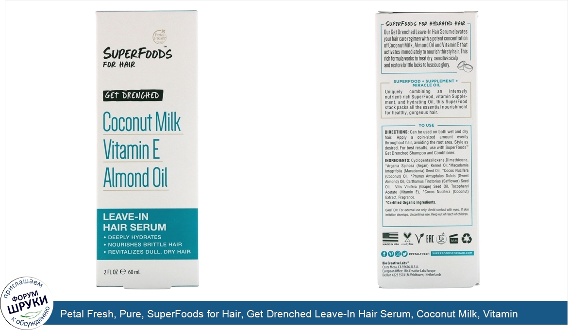 [DESCRIPT]Deeply Hydrates. Nourishes Brittle Hair. Revitalizes Dull, Dry Hair. No Sulfates. Vegan. Cruelty-Free. No Harsh Preservatives. pH Balanced. No Parabens. Color-Safe. No Phthalates. No Colors Added. Our Get Drenched Leave-In Hair Serum elevates your hair care regimen with a potent concentration of Coconut Milk. Almond Oil and Vitamin E that activates immediately to nourish thirsty hair. This rich formula works to treat dry, sensitive scalp and restore brittle locks to luscious glory. Superfood + Supplement + Miracle Oil. Uniquely combining an intensely nutrient-rich SuperFood, vitamin Supplement, and hydrating Oil, this SuperFood stack packs all the essential nourishment for healthy, gorgeous hair. Our Story. Based in sunny Southern California, Petal Fresh was started by a group of passionate individuals pursuing more natural and healthy lifestyles. At Petal Fresh, we believe that what you put on your body is just as important as what you put in it. We infuse our formulas with the most natural, Certified Organic ingredients to create effective products, naturally. Our Ingredients. Coconut Oil provides moisture and nourishment while acting as a natural detangler and conditioner for softer hair. Vitamin E promotes healthy hair moisture supporting the function of Keratin protein in hair. Almond Oil is not only high in Vitamin E and antioxidants, it is also an excellent conditioner for softer, silkier and shinier hair.[/DESCRIPT]... (описание дополняется)