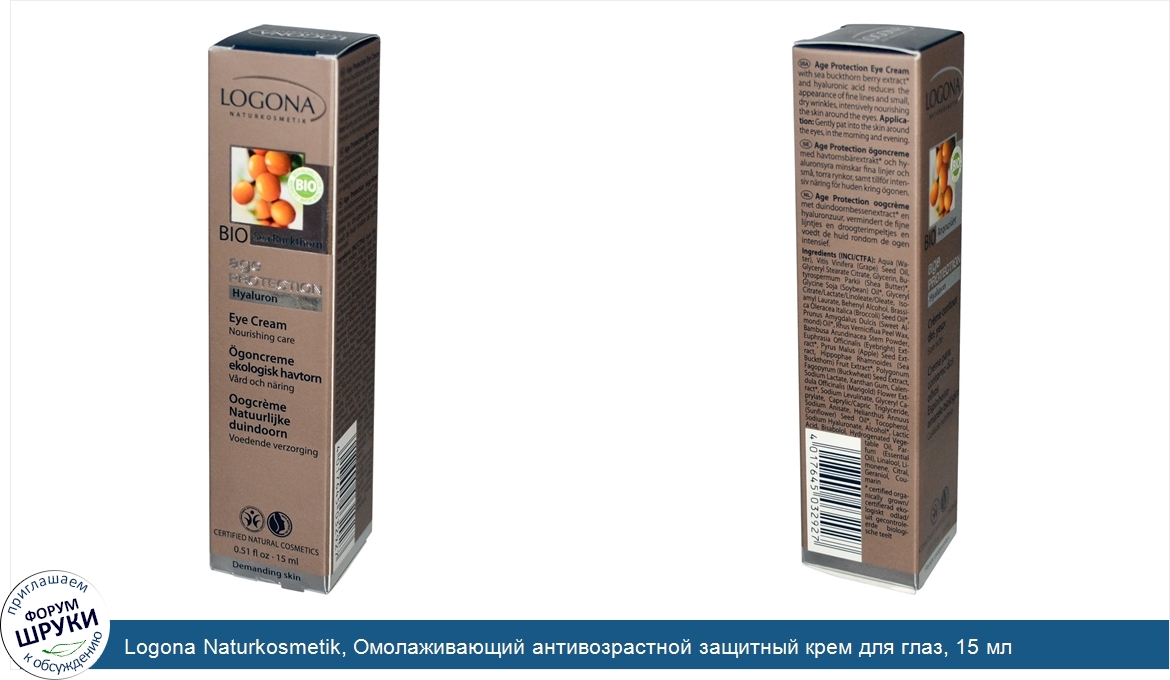 Logona Naturkosmetik, Омолаживающий антивозрастной защитный крем для глаз, 15 мл
