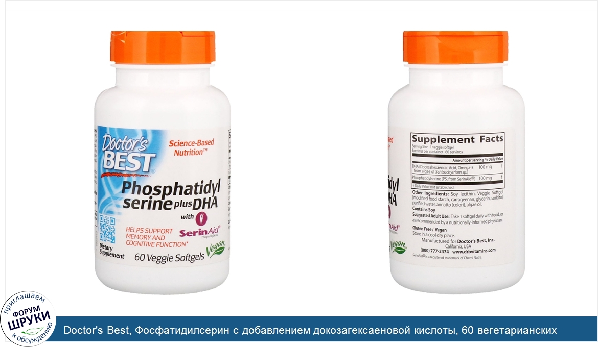 Продукт питания, польза которого доказана научно. Помогает поддержать память и когнитивную функцию. С фосфатидилсерином SerinAid. Пищевая добавка. Продукт для веганов. Не содержит глютена. Doctor's Best Phospahti...