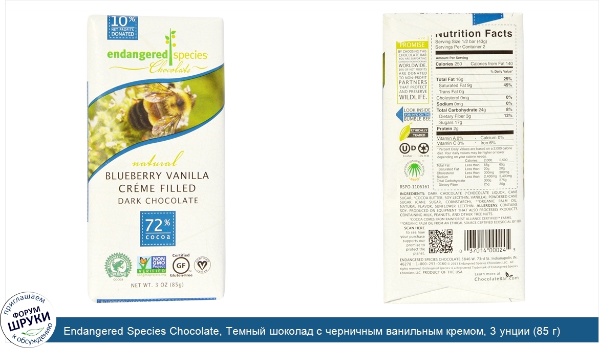 Друзья, если у вас есть отзыв/дополнение/комментарий/вопрос относительно Endangered Species Chocolate, Темный шоколад с черничным ванильным кремом, 3 унции (85 г) - напишите его ответом в эту тему (это будет полезно всему сообществу в целом и вам в отдельности).