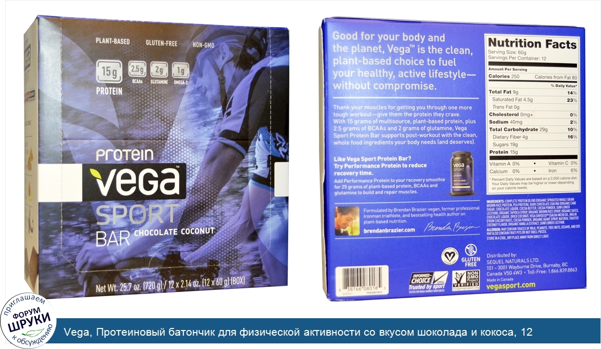 [DESCRIPT]На растительной основе. Не содержит глютен. Без ГМО. 15 г белка. 2,5 г аминокислот с разветвленной цепью. 2 г глутамина. 1 г Омега-3. Подготовка - Поддержка -. Восстановление. Новый вкус. Протеиновый батончик для физической активности со вкусом шоколада и кокоса Vega. 15 грамм белка, полученного из разнообразных растительных источников. 1 грамм Омега-3 из масла SaviSeed. В каждом батончике содержатся цельные продукты. Vega Sport – это единственная полноценная, растительная система улучшения спортивной производительности, специально разработанная для спортсменов, чтобы они могли показать лучший результат до, во время и после тренировки и на соревнованиях. Vega не наносит вреда вашему организму и планете, этот чистый растительный продукт заряжает ваш организм энергией, чтобы вы могли вести активный образ жизни и вам не приходилось идти на компромисс. Поблагодарите ваши мышцы за очередную усердную тренировку — наградите их необходимым количеством белка. Протеиновый батончик для физической активности Vega содержит 15 грамм белка, полученного из разнообразных растительных источников, 2,5 грамма BCAA и 2 грамма глутамина и с помощью натуральных, цельных питательных ингредиентов обеспечивает необходимую (и заслуженную) поддержку организма после тренировки. Vega создана Брендоном Брейзером, вегетарианцем, профессиональным триатлонистом и автором бестселлеров по правильному вегетарианскому питанию.[/DESCRIPT]... (описание дополняется)