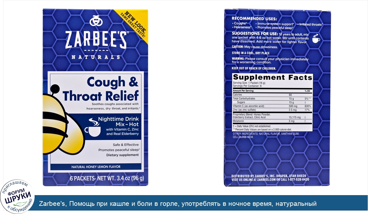 [DESCRIPT]Soothes Coughs Associated With Hoarseness, Dry Throat, and Irritants. Mix - Hot. With Vitamin C, Zinc and Real Elderberry. Safe Effective. Promotes Peaceful Sleep. Dietary Supplement. No Drugs or Alcohol. No Dyes. No Artificial Flavors. No Artificial Sweeteners. Gluten-Free. Zarbee's Story. Dr. Zak Zarbock, a physician and father, couldn't find effective chemical-free products to keep the whole family healthy, so he created his own products, including handpicked natural ingredients, whenever possible. The result is Zarbee's Naturals. Our Cough Throat Relief Drink Mixes are specially formulated, proprietary blend of dark honey formulated to safety coat the throat and calm occasional coughs. Recommended uses:. coughs. hoarseness. immune system support. promotes peaceful sleep. irritated throats. Safe Effective. Soothes coughs associated with hoarseness, dry throat and irritants. Made with our proprietary dark honey blend. Melatonin promotes peaceful sleep.[/DESCRIPT]... (описание дополняется)