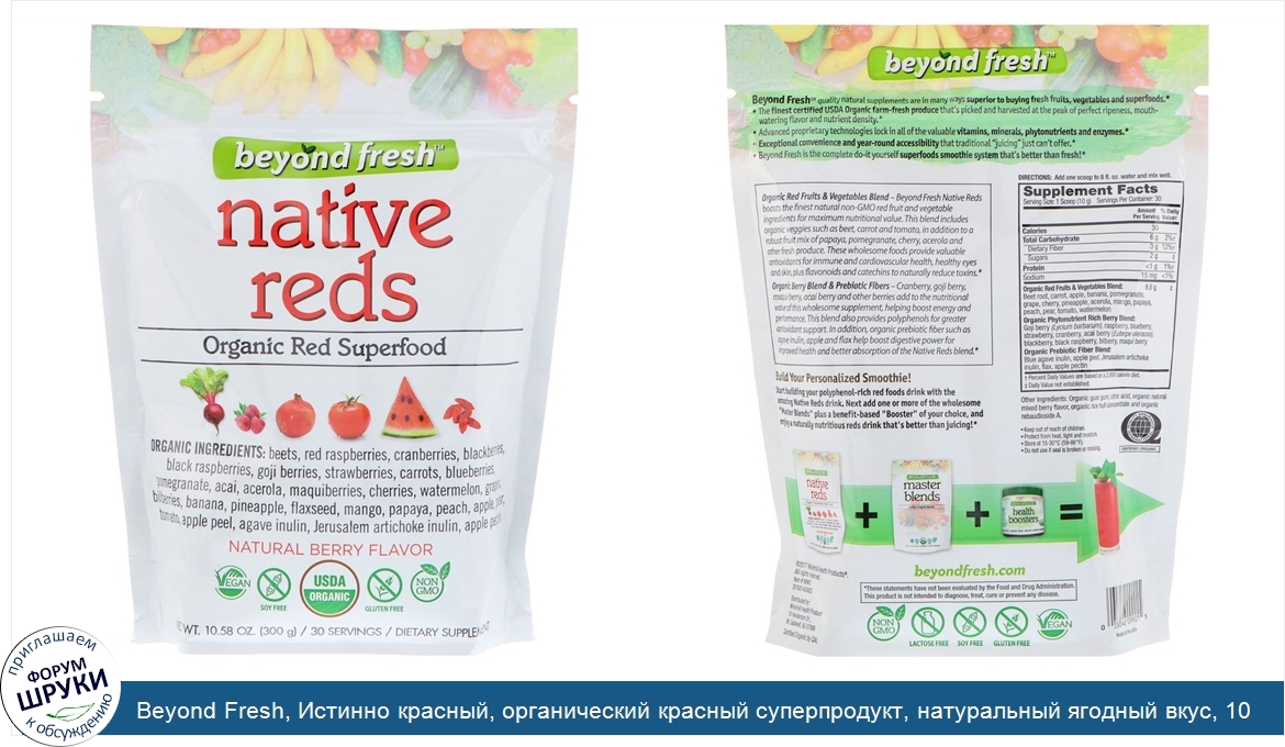 [DESCRIPT]Vegan. Soy Free. USDA Organic. Gluten Free. Non GMO. 30 Servings. Dietary Supplement. Lactose Free. Certified Organic by QAI - Quality Assurance International. Beyond Fresh quality natural supplements are in many ways superior to buying fresh fruits, vegetables and superfoods. The finest certified USDA Organic farm-fresh produce that's picked and harvested at the peak of ripeness, mouth-watering flavor and nutrient density. Advanced proprietary technologies lock in all of the valuable vitamins, minerals, phytonutrients and enzymes. Exceptional convenience and year-round accessibility that traditional "juicing" just can't offer. Beyond Fresh is the complete do-it-yourself superfoods smoothie system that's better than fresh! Organic Red Fruits Vegetable Blend. - Beyond Fresh Native Reds boasts the finest natural non-GMO red fruit and vegetable ingredients for maximum nutritional value. This blend includes organic veggies such as beet, carrot and tomato, in addition to a robust fruit mix of papaya, pomegranate, cherry, acerola and other fresh produce. These wholesome foods provide valuable antioxidants for immune and cardiovascular health, healthy eyes and skin, plus flavonoids and catechins to naturally reduce toxins. Organic Berry Blend Prebiotic Fibers. - Cranberry, goji berry, maqui berry, acai berry and other berries add to the nutritional value of this wholesome supplement, helping boost energy and performance. This blend also provides polyphenols for greater antioxidant support. In addition, organic prebiotic fiber such as agave inulin, apple and flax help boost digestive power for improved health and better absorption of the Native Reds blend.[/DESCRIPT]... (описание дополняется)