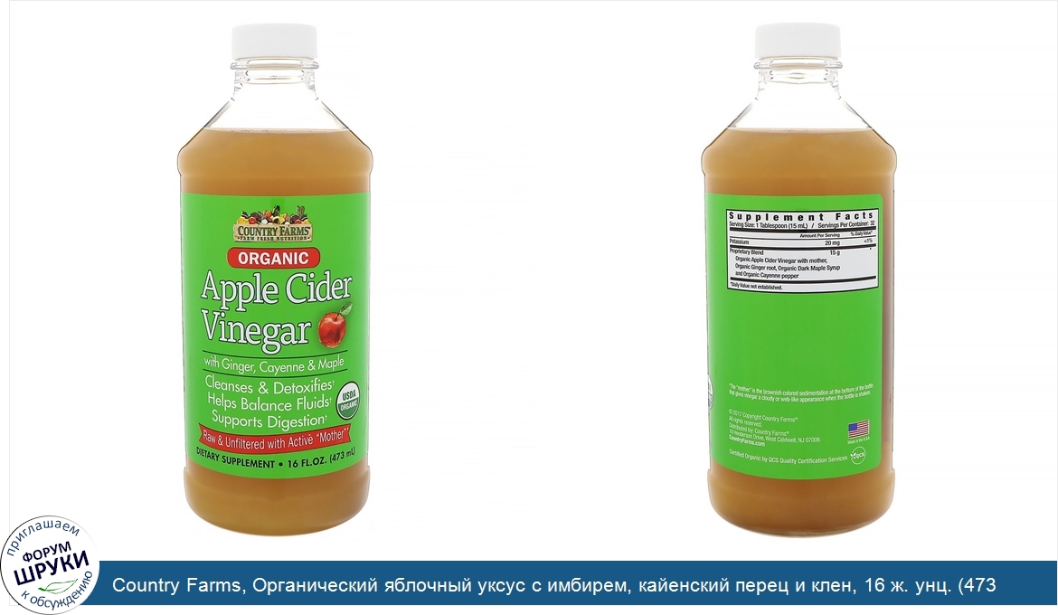 Друзья, если у вас есть отзыв/дополнение/комментарий/вопрос относительно Country Farms, Органический яблочный уксус с имбирем, кайенский перец и клен, 16 ж. унц. (473 мл) - напишите его ответом в эту тему (это будет полезно всему сообществу в целом и вам в отдельности).
