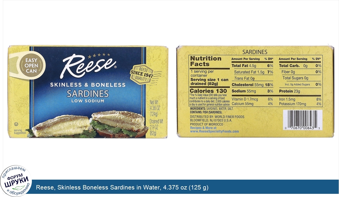 Друзья, если у вас есть отзыв/дополнение/комментарий/вопрос относительно Reese, Skinless Boneless Sardines in Water, 4.375 oz (125 g) - напишите его ответом в эту тему (это будет полезно всему сообществу в целом и вам в отдельности).
