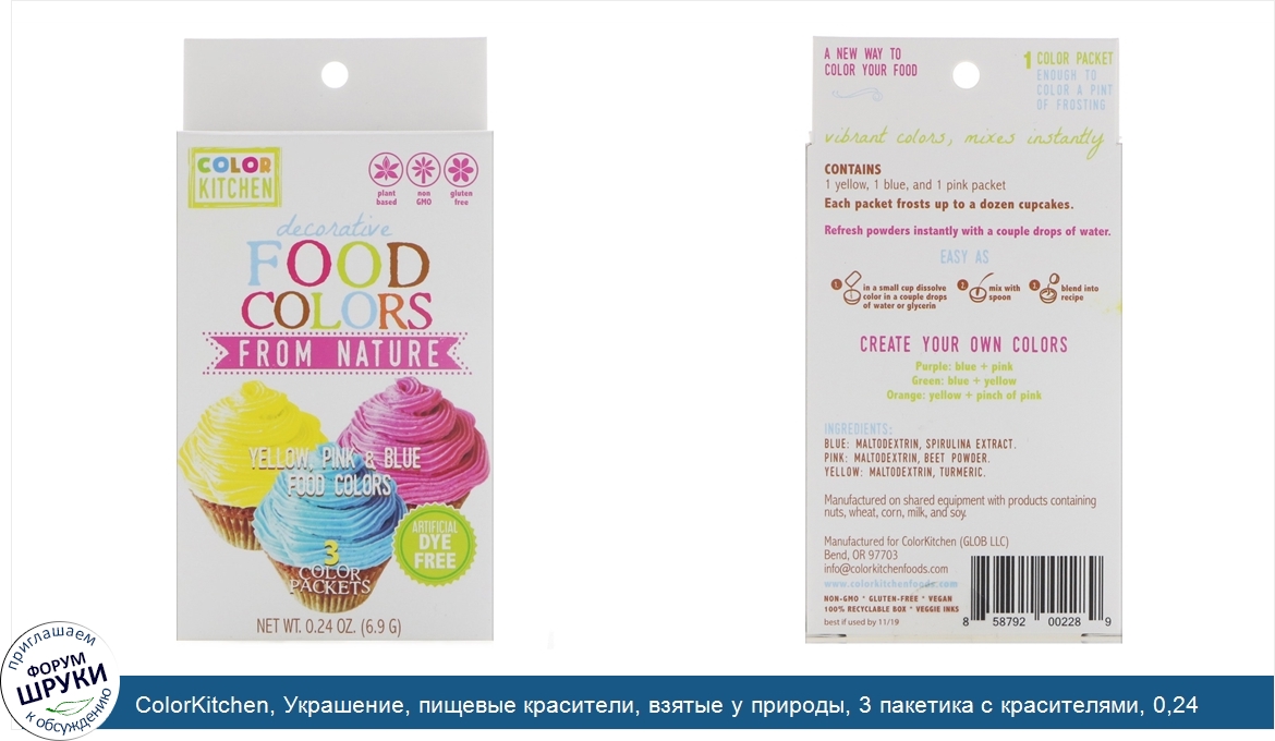 Друзья, если у вас есть отзыв/дополнение/комментарий/вопрос относительно ColorKitchen, Украшение, пищевые красители, взятые у природы, 3 пакетика с красителями, 0,24 унц. (6,9 г.) - напишите его ответом в эту тему (это будет полезно всему сообществу в целом и вам в отдельности).