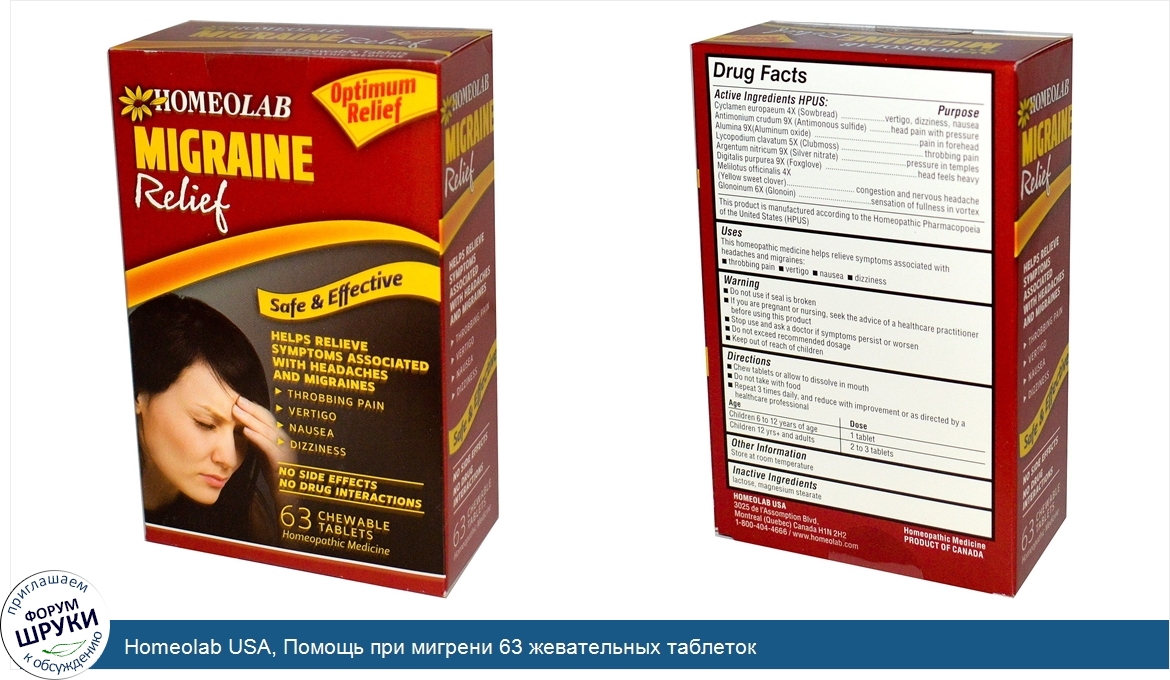 Homeolab USA, Помощь при мигрени 63 жевательных таблеток